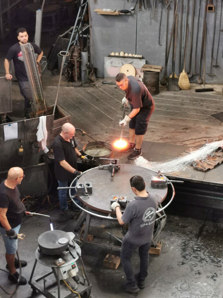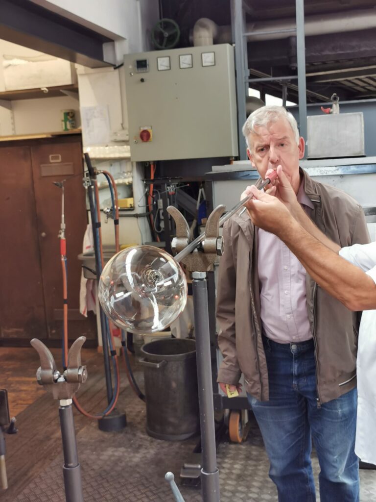 Zum Abschluss gelangten wird in die von den Öfen erhitzten Arbeitsstätte, schauten zu wie interessante Glasformationen entstanden. Nun wissen wissen wir genau woraus das Glas besteht und wie es geformt wird. Das zu sehen war ein echtes Erlebnis. Ein Mitglied von give&get nutzte die Gelegenheit, selbst eine Glaskugel zu blasen.